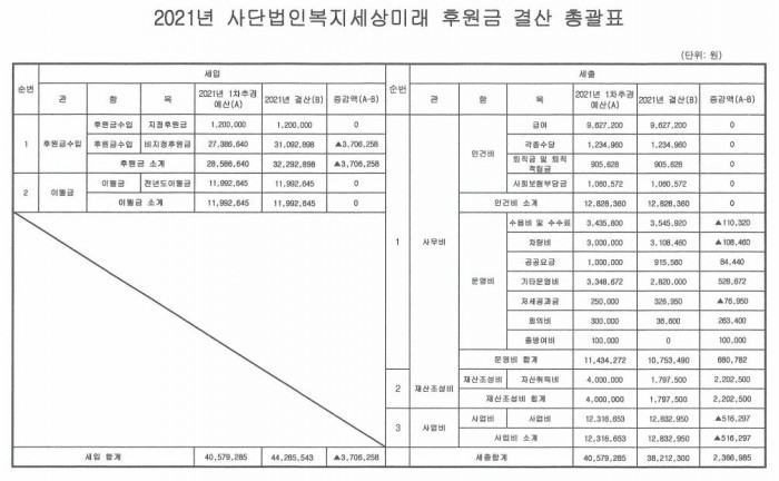 2021년 사단법인복지세상미래 후원금(품) 결산보고