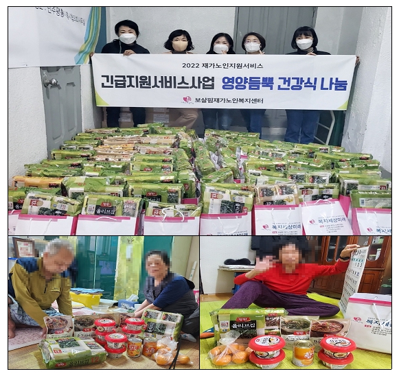 ‘영양듬뿍 건강식’식품 꾸러미는 저소득층 독거노인, 노인부부, 조손가정 84가구에 죽세트, 국세트, 김세트, 황도, 귤 등으로 구성하여 1가구당 2만원 상당의 키트를 전달하였다.