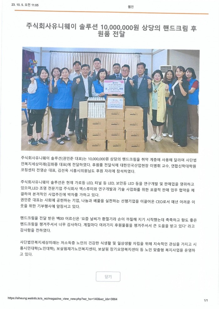 주식회사 유니웨이솔루션 10,000,000원 상당의 핸드크림 후원