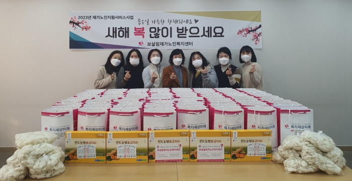 떡국떡과 처음처럼 봉사회 후원품 진도울금 세트와 함께 배부.